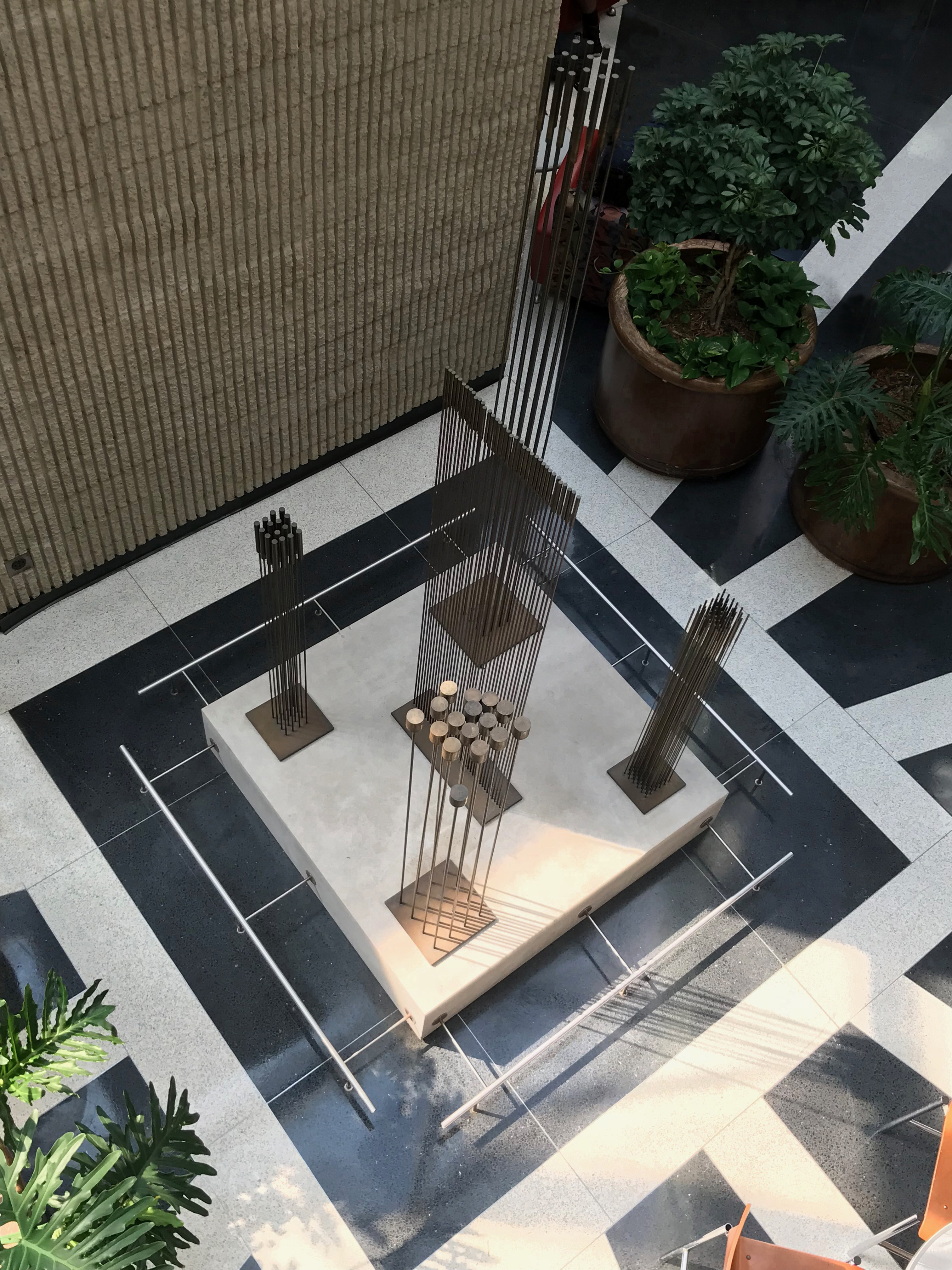 Originally designed for Guzzetta’s opening on March 31, 1976, the entire piece consists of five separate sculptures arranged on a stone base. Each sculpture features vertical metal rods, carefully spaced in a grid pattern and topped with small metal cylinders. When the rods are bent and released, they sway and collide, producing a metallic harmony. Because the rods vary in height, spacing and thickness, each one produces a slightly different sound, creating a beautiful melody.